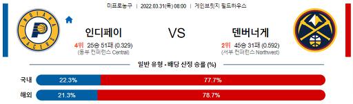 3월 31일 08:00 NBA분석 인디애나 : 덴버