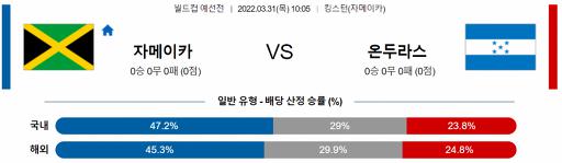 자메이카의 승리를 예측하겠다. 자메이카의 수비력이 좋지 않기는 하지만 온두라스의 득점력이 매우 좋지 않다. 홈에서는 미국과 캐나다와도 비등한 경기를 한 것은 높게 평가해야 한다. 다만 좋지 않은 수비력으로 인해 스코어로 접근하는 것은 신중해야 한다. 홈 승 쪽으로 가닥을 잡는 것이 좋다.