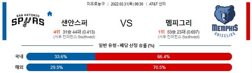 3월 31일 09:30 NBA분석 샌안토니오 : 멤피스