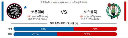 이전경기(3/27) 홈에서 인디애나 상대로 131-91 승리를 기록했으며 이전경기(3/25) 홈에서 클리블랜드 상대로 117-104 승리를 기록했다. 2연승 흐름 속에 시즌 42승32패 성적. 인디애나 상대로는 팀 수비의 핵심이 되는 OG 아누노비의 결장이 이어지는 가운데 게리 트렌트 주니어가 추가적으로 결장했지만 리바운드와 턴오버 싸움에서 우위를 기록했고 한수위 화력쇼를 선보인 경기. 파스칼 시아캄(23득점, 7어시스트, 6리바운드)이 패스가 되는 뛰어난 기동력을 보유한 빅맨의 모습을 선보였으며 크리스 부셰(15득점, 10리바운드), 프레셔스 아치우와(18득점, 6리바운드)등 빅맨들의 물량 공세를 통해서 상대 프런트 코트 자원들의 위력을 반감 시키는데 성공했던 상황. 또한, 이타적인 움직임과 일선에서의 스틸의 힘이 부활한 토론토의 모습을 확인할수 있었던 승리의 내용 이였다.