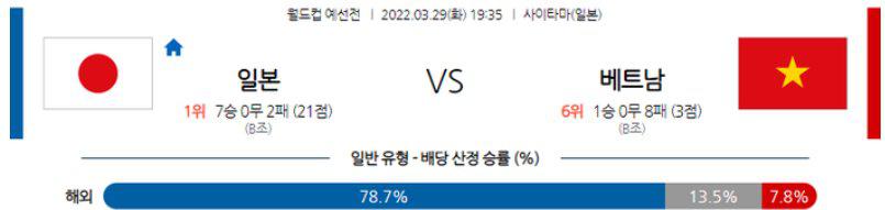 일본의 승리가 예상되는 매치다. 그러나 언오버 선택은 신중해야 할 필요는 있다. 역대 전적에서 제법 베트남이 선전하고 있고, 일본도 승리를 거두면 조 1위를 확정 짓는 상황에서 큰 점수차는 무리하게 노리지 않을 것이다. 핸디(-1.0)승 까지는 해볼만한 선택이지만, 오버(2.5)는 신중하는 것이 좋다.