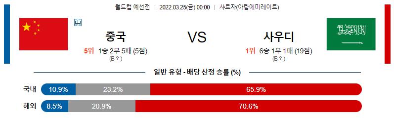 사우디의 승리를 점친다. 중국은 귀화 선수들이 주소모두 명단 제외되어 변변한 공격을 하기도 어렵다. 사우디가 공격의 두 핵심 선수를 앞세워 다득점 승리를 노릴 것이다. 월드컵 자력 진출이라는 동기부여도 충분하다. 사우디의 핸디(+1.0) 승까지도 노릴 수 있을 것이다.