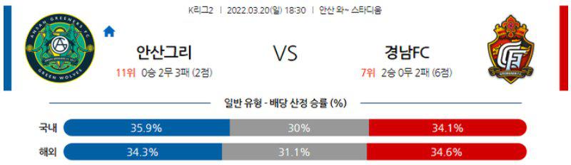 언더(2.5)가 주력이다. 양 팀이 주소모두 외국인 공격수들이 결장하여, 공격진에서는 누수가 크다. 안산이 수비 시 미스가 많고, 경남은 센터백 자원들의 복귀로 수비에서 한 숨 돌렸다. 경남이 근소하게 우세하다고 본다.