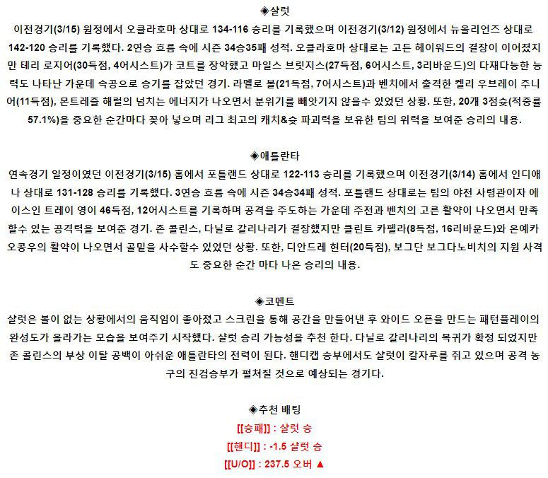 【NBA】 3월17일 샬럿 vs 애틀란타