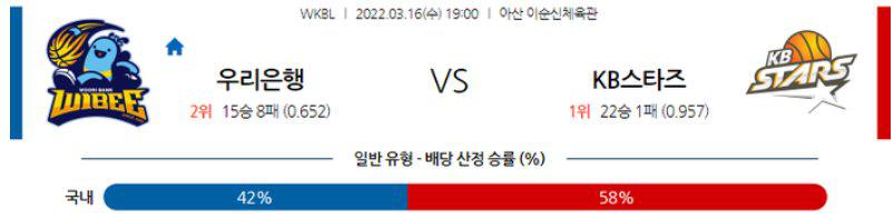 우리은행은 휴식기 이후 첫 경기 일정이 팀내 코로나 확진자 발생에 따른 가용 인원 부족으로 취소 되었다. 우리은행이 정상전력이 아니라는 것에 베팅 포커스를 맞춰야 한다. KB스타즈 승리 가능성을 추천 한다.