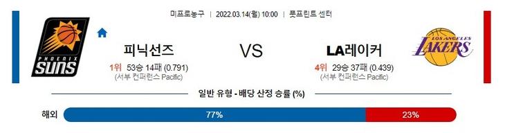 패스게임을 통해서 찬스를 만드는 능력과 기본적인 수비력에서 LA레이커스 보다 피닉스가 우위에 있는 전력 이다. 피닉스 승리 가능성을 추천 한다.