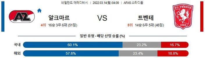 이번 일정에서는 홈 팀 알크마르의 선전을 예상한다. 최근 치른 리그 14경기 째 패배가 없는 상황. 압도적인 퍼포먼스를 자랑하며 반등을 노리고 있다. 이번 일정 승리를 통해 리그 3위 진입이 가능하기에 홈 이점과 함께 우세 전력을 앞세워 승점 확보를 챙길 것으로 예상된다. 다만, 트벤테 역시 꾸준히 득점에 성공하며 득점 생산이 충분히 가능한 전력이다. 대량 득점 양상으로 전개될 공산이 크다. 오버(2.5 기준) 접근과 함께 알크마르 승을 추천한다.