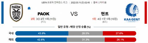 UEFA 유로파리그 3월 11일 02:45 PAOK : KAA 헨트
