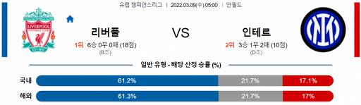 UEFA 챔피언스리그 3월 9일 05:00 리버풀 : 인터 밀란