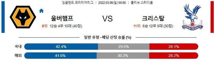 【프리미어리그】 3월 6일 울버햄튼 vs 크리스탈 팰리스
