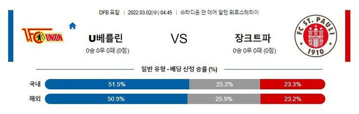 【독일 FA컵】 3월02일 우니온 베를린 vs 장크트 파울리