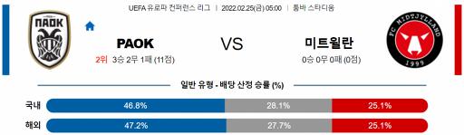 유로파리그 2월 25일 05:00 PAOK : FC 미트윌란