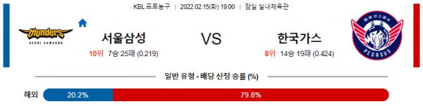 [KBL] 2월 15일 서울 삼성 vs 대구 한국가스공사서울 삼성은 연속경기 일정였던 직전경기(2/13) 홈에서 서울 SK 상대로 74-98 패배를 기록했으며 이전경기(2/12) 홈에서 창원 LG 상대로 77-90 패배를 기록했다. 한국가스공사 상대로 11연패 에서 벗어나는 승리가 나왔지만 연승 없이 다시금 8연패에 빠지게 되었으며 시즌 7승31패 성적. 서울 SK 상대로는 토마스 로빈슨(25득점, 14리바운드)이 분전했지만 다니엘 오셰푸가 부상으로 4경기 연속 결장했고 38.8%의 저조한 야투 성공률에 그쳤던 경기. 리바운드 싸움에서 -19개 마진으로 밀리는 가운데 토종 선수들이 온 힘을 쏟았지만 전력 누수에 따른 한계를 피할수 없었고 1쿼터(13-34) 부터 무너지면서 승부의 추가 많이 기울어진 상황. 또한, 약속 된 수비가 전혀 되지 않았고 승리에 대한 선수들의 열정도 사라진 패배의 내용.