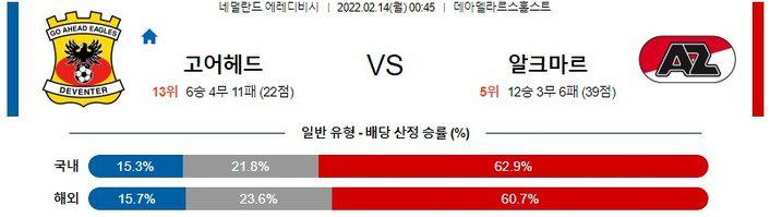 [에레디비시] 2월 14일 고 어헤드 이글스 vs AZ 알크마르고 어헤드 (리그 13위 / 패승무패승)