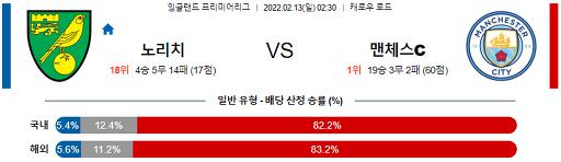 프리미어리그 2월 13일 02:30 노리치 시티 FC : 맨체스터 시티