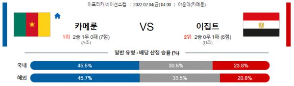 카메룬의 우위를 예상한다. 체력, 홈 어드밴티지, 전술적 우위 주소모두 카메룬이 앞서고 있다. 카메룬이 16강과 8강에서 보여줬던 전술을 그대로 들고 나올 것이 높다. 이집트가 공격 작업이 원활하다면 모르겠으나, 이집트의 공격 작업은 완성도가 그렇게 높지 않다. 이집트가 스스로 말릴 가능성도 높은 편. 다만 카메룬도 대량득점을 무리하게 노리지는 않을 것이다. 스코어는 언더(2.5)가 유력하다. 카메룬 승 / 언더를 주력으로 삼으면 좋다.