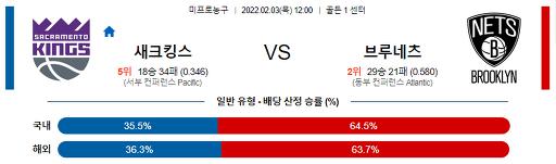 2월 3일 12:00 NBA분석 새크라멘토 : 브루클린