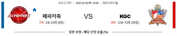 [KOVO 여자배구] 2월 3일 페퍼저축은행 vs KGC인삼공사페퍼저축은행은 직전경기(1/31) 홈에서 현대건설 상대로 0-3(17:25, 22:25, 12:15) 패배를 기록했으며 이전경기(1/18) 홈에서 IBK기업은행 상대로 3-0(25:18, 25:22, 25:21) 승리를 기록했다. IBK기업은행 상대로 17연패에서 벗어나는 승리가 나왔지만 연승 도전은 물거품 되었으며 시즌 2승23패 성적. 현대건설 상대로는 엘리자벳(18득점, 50%)이 분전했지만 나머지 선수들에게 두 자리수 득점을 기록한 선수가 나오지 않았고 신인왕 후보로 거론되고 있던 박은서가 부상으로 교체 자원으로만 활용 된 경기. 16.42%의 낮은 리시브 효율성을 기록했던 탓에 하이볼 처리가 많았고 자신들의 코트 위로 띄워놓은 볼을 서로 미루다가 처리하지 못하는 범실이 여전히 많았던 상황. 또한, 이현 세터의 토스도 흔들렸으며 블로킹(5-15), 서브(1-4), 싸움에서 완패를 당한 패배의 내용.