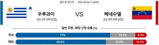우루과이가 이길 가능성이 높다. 이전 경기 베네수엘라의 경기력은 놀라웠지만 홈에서 볼리비아를 상대로 거둔 승리라는 사실을 잊어서는 안된다. 전력에서 앞서는 우루과이를 상대로는 역부족일 가능성이 높다. 우루과이가 다득점 승리를 거둘 가능성이 높으며 핸디(-1.0)를 줘도 무난하게 승리할 것이다. 다만 우루과이 공격진 노쇠화 문제가 있으므로, 스코어는 오버 ▲(2.5)를 충족 시키지는 못할 것이다.