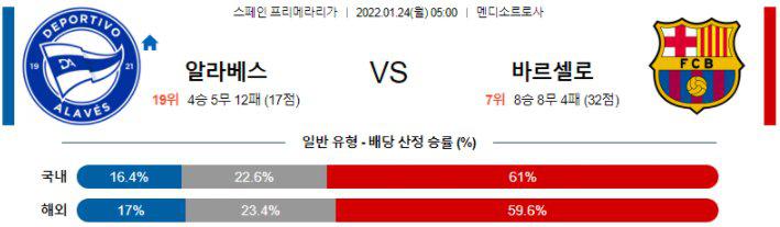 이전 라운드 베티스 전서 0-4 대패를 당했다. 앞선 컵 대회 포함, 공식전 8경기 연속 무승을 잇는 중이다. 팀 에너지 레벨이 극도로 떨어진 상황서 이번 라운드 이변 발생은 불가하다.호셀루(FW, 최근 5경기 2골 1도움) 의존도가 전혀 떨어지지 않는다. 리그 16골을 적중했는데, 그 중 10골을 혼자서 책임졌다. 시즌 초·중반 측면 조합의 분전으로 오히려 좋은 시너지를 내나 싶었지만 사이드가 부진에 빠지자 혼자 고립되는 경우가 잦다. 이전 라운드에선 멘데즈(RW)를 1선으로 함께 기용해봤지만 어색한 스위칭과 더불어 겹치는 경우가 많았다. 상대 센터백은 작정하고 호셀루만 옭아매면 알라베스 전체 공격을 제어하기 평이하다. 무득점에 그칠 공산이 높다.변수는 1차전 맞대결이다. 물론 당시 바르셀로나 부진의 골이 깊었다는 점을 고려하더라도 1골 내로 실점을 최소화한 것은 긍정적인 요소다. 해당 경기서 점유율 21대79, 슈팅 수 3대16으로 밀렸으나 클리어링 36개와 볼 차단 17개를 성공하는 등, 수비진 집중력을 90분 내내 잃지 않았다. 물론 상대 강공에 1~2실점 허용은 불가피하겠으나, 그 이상의 대량 실점 위기는 넘길 것으로 점쳐진다.