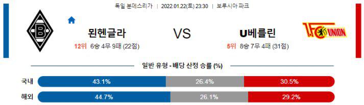 [분데스리가] 1월 22일 묀헨글라트바흐 vs 유니온 베를린