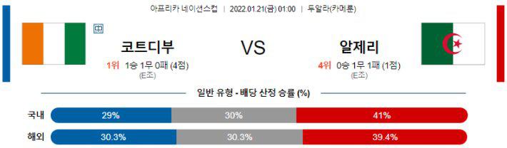 코트디부아르가 오히려 근소 우위다. 수비력과 공격력 주소모두 코트디부아르가 알제리보다 훨씬 효율적이고 기복이 적다. 코트디부아르가 역배당이라 코트디부아르에 핸디(+1.0)를 주고 승리를 점치는 것이 가장 좋은 픽이다. 알제리의 공격 효율이 극악인 것과, 코트디부아르도 무리할 이유는 전혀 없다는 것을 감안하면 언더(2.5)가 나올 것이 유력하다.