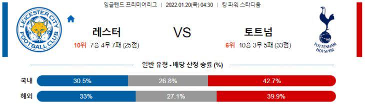 감독을 교체한 효과를 톡톡히 보고 있다. 비록 지금은 6위지만, 연기된 두 경기를 주소모두 잡아낸다면 곧바로 4위까지 수직 상승한다. 리그에서 8경기 무패 행진을 달리고 있어 기세도 매우 좋은 상황. 엔트리 공백이 심한 레스터를 상대로도 우위를 점할 것으로 보인다.득점 가능성은 높다. 물론 최근 두 경기에서는 2득점에 그치기는 했다. 하지만 무패 기간 동안을 보면, 8경기 13득점으로 멀티골 득점 경기가 5경기나 된다. 최근 수비가 아예 무너져버린 레스터를 공략하기에는 충분히다. 손흥민(LW 최근 5경기 1골 1도움)이 나오지 못하지만, 누누 감독 체제에서 1골에 그쳤던 케인(FW 최근 5경기 2골)의 폼도 제법 올라온 상태다. 다득점 전망도 밝은 상황.실점 가능성은 적다. 일단 콘테 특유의 3백 시스템을 가동하며 데이비스(LB)가 왼쪽 스토퍼로 기용되었고, 컵대회 첼시전(0-1 패)에서 가장 많은 인터셉트인 3회를 기록하며 완전히 각성한 모습이다. 특히 상대팀의 주포와 대부분의 공격자원들이 결장할 예정이라는 것도 좋은 징조. 무실점도 충분히 가능하다.