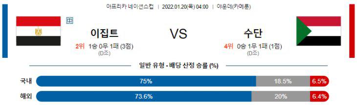 이집트의 승리가 예상된다. 주전이 거의 다 출격할 이집트가 객관적 전력에서 앞선다. 빈공 VS 빈공 양상이 되겠지만, 결국 ‘해결사’를 가지고 있는 쪽은 이집트다. 하지만 살라를 제외하면 다른 공격진의 부진이 심각하다. 따라서 이집트가 이기더라도 크게 이기지는 못할 것이다. 따라서 핸디(-1.0)를 주고는 승리 가능성이 적다. 고배당을 노린다면 핸디(-2.5)를 주고 수단에 걸어보는 것도 좋은 선택. 확실한 것은 이집트 승 언더 ▼(2.5)가 가장 안전한 픽이다.