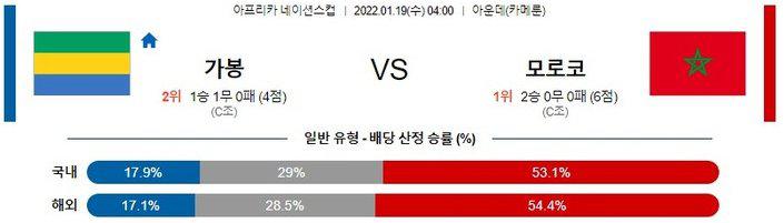 득점 가능성은 있지만, 무리하지는 않을 것이다. 두 팀이 비기기만 해도 사이 좋게 1, 2위로 진출하게 된다. 따라서 모로코가 무리하게 공격에 나설 이유는 전혀 없다. 다만 가봉에게 패한다면 조 2위로 내려앉기 때문에, 쉬운 토너먼트 대진을 위해서라도 최소한의 득점은 만들 공산이 크다. 경기 당 15.5개의 슈팅을 만들어내고 있으니, 일단 스코어를 벌리고 소강 상태를 유지할 가능성이 높다. 전력 상 대량 득점 능력은 충분히 가지고 있지만, 대량 득점 가능성은 낮다.