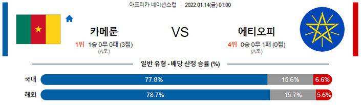 카메룬의 승리를 예상해본다. 에티오피아의 조직력은 상당하나, 홈구장 어드밴티지가 없다는 것은 치명적이다. 오히려 카메룬이 홈구장 어드밴티지를 가지는 만큼, 다득점 승리로 산뜻하게 대회를 시작할 것이다. 오버(2.5 기준) / 카메룬 승리를 가닥으로 잡자.