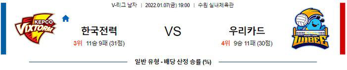 우리카드는 직전경기 승리후 대한항공의 틸리카이넨 감독으로 부터 '이길 자격이 있었다고 생각하고 우리은행 선수들의 경기력이 좋았다는 말을 들었다.' 우리은행의 경기력이 많이 올라온 타이밍이며 한국전력은 현재 우리카드전 5연패에 빠진 가운데 우리카드를 만나면 리시브 라인이 흔들리는 문제점이 발생했다. 우리카드 승리 가능성을 추천 한다.
