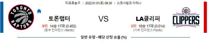 팀의 해결사 역할을 해주고 있던 프레드 밴블릿과 벤치 자원이 되는 스코티 반스의 코로나 프로토콜이 12월31일 해제되는 토론토가 폴 조지 포함 9명의 선수가 부상자 명단에 있는 LA 클리퍼스 보다 화력 대결에서 우위에 있다. 토론토 승리 가능성을 추천 한다.