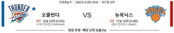 오클라호마에게 닥친 부상+ 코로나 프로토콜 악몽 때문에 역동적인 팀 에너지가 실종된 모습이 나타나고 있는 타이밍 이다. 뉴욕 승리 가능성을 추천 한다.​​