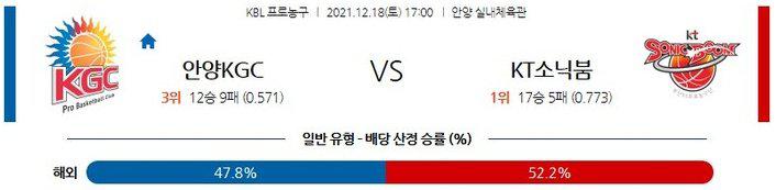 KGC인삼공사는 직전경기(12/16) 원정에서 서울 SK 상대로 112-99 승리를 기록했으며 연속경기 일정이였던 이전경기(12/12) 홈에서 서울 삼성 상대로 103-80 승리를 기록했다. 2연승 흐름 속에 시즌 12승9패 성적. 서울 SK 상대로는 오마리 스펠맨(30득점)이 맹활약했고 18개 3점슛을 47.4%의 높은 적중률 속에 림에 꽂아 넣는 화력쇼를 선보인 경기. 오세근이 토종 빅맨 싸움에서 다양한 기술로 상대를 압도했고 변준형(18득점, 12어시스트)가 상대 코트를 휘젓고 다녔던 상황. 또한, 문성곤이 수비와 리바운드에 높은 에너지를 보여주는 가운데 8차례 3점슛 시도에서 5개를 성공시킨 전성현(19득점)이 국가대표 슈터의 위엄을 보여준 승리의 내용.