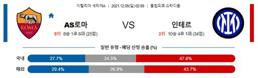 전력 우세를 앞세운 인터 밀란이 상대를 몰아칠 준비를 마쳤다. 맞대결서 상대에 고전했지만 승기를 뺏긴 적은 없고, 최근 상승세가 인상적이다. 로마가 난전을 꾀하지만 기복이 심한 수비로 인해 불안을 가중시킨다. 인터 밀란 승, 오버 ▲(2.5점 기준)를 예상하는 쪽이 옳다.