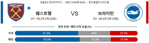열람중 프리미어리그 12월 2일 04:30 웨스트햄 : 브라이튼 앨비언 2021.12.01 480