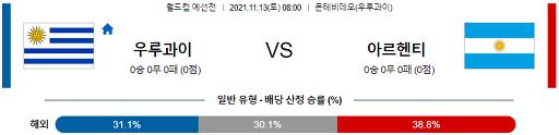 근소 전력 우세를 앞세운 아르헨티나가 상대를 몰아칠 준비를 마쳤다. 이번 예선전 원정 불리도 크지 않고, 앞선 맞대결서도 완승을 거둔 좋은 기억이 있다. 우루과이가 난전을 유도하지만 후방이 무너진 상황서 저항할 재간이 마땅치 않다. 아르헨티나 승, 언더 ▼(2.5점 기준)를 예상하는 쪽이 옳다.