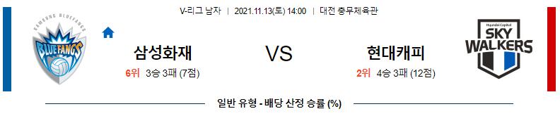 현대캐피탈은 직전경기(11/10) 원정에서 대한항공 상대로 1-3(25:19, 22:25, 22:25, 21:25) 패배를 기록했으며 이전경기(11/5) 홈에서 삼성화재 상대로 3-0(25:19, 25:11, 26:24) 승리를 기록했다. 시즌 4승3패 성적. 대한항공 상대로는 허수봉(23득점, 57.14%)이 분전했지만 문성민(6득점, 41.67%)의 공격이 터지지 않았던 경기. 문성민의 공격 가담이 떨어지자 1세트를 가져오고도 2,3세트 뒷심 대결에서 밀렸고 블로킹(4-8), 서브(4-5) 싸움에서 밀렸던 상황. 다만, 4세트 교체로 신고식을 치른 외인 히메네즈(11득점, 73.33%)가 성공적인 데뷔전을 치른 것은 위안이 되는 요소.