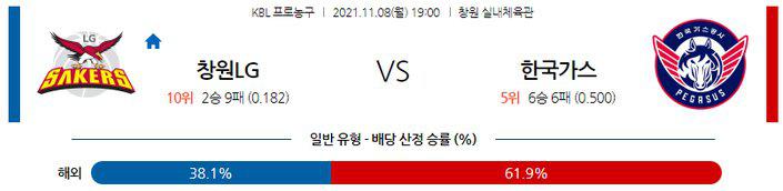 한국가스공사는 직전경기(11/6) 원정에서 원주DB 상대로 84-80 승리를 기록했으며 이전경기(11/4) 홈에서 서울 삼성 상대로 86-56 승리를 기록했다. 2연승 흐름 속에 시즌 6승6패 성적. 원주DB 상대로는 무릎 부상이 있는 두경민이 결장했지만 김낙현(23득점, 12어시스트)와 득점기계 앤드류 니콜슨(30득점, 12리바운드)이 고비때 마다 득점을 해냈던 경기. 차바위가 수비에서 높은 에너지 레벨을 선보였으며 이대헌은 로우 포스트에서 알토란 득점을 지원했던 상황. 또한, 4쿼터(28-19)에 강한 뒷심을 보여준 역전승 이였다.