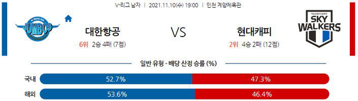 현대캐피탈은 직전경기(11/5) 홈에서 삼성화재 상대로 3-0(25:19, 25:11, 26:24) 승리를 기록했으며 이전경기(10/31) 원정에서 한국전력 상대로 0-3(15:25, 11:25, 15:25) 패배를 기록했다. 시즌 4승2패 성적. 삼성화재 상대로는 베테랑 문성민(16득점, 66.67%)이 높은 공격성공률이 동반 된 공격으로 팀 분위기를 끌어 올렸고 서브(4-2), 블로킹(13-2), 범실(7-24) 싸움에서 주소모두 우위를 점령한 경기. 허수봉(16득점, 66.67%)도 문성민과 함께 해결사로 나섰으며 박상하(9득점, 80%, 블로킹 5득점), 최민호(6득점, 50%, 블로킹 3득점)는 중앙에서 단단한 벽이 되어준 상황. 또한, 원 포인트 블로커로 투입 된 로날드 히메네즈와 베테랑 여오현 리베로가 시즌 첫 경기를 소화하게 되면서 팀에 새로운 활력소가 되어준 승리의 내용.