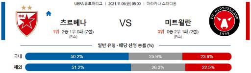 유로파리그 11월 5일 05:00 츠르베나 즈베즈다 : FC 미트윌란