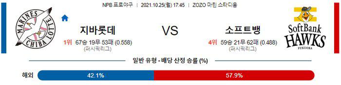 6년 연속 두 자리수 승리를 노리고 있는 센가 고다이 투수 이지만 가을야구에서 탈락한 소프트뱅크 야수들이 원정경기 일정에 센가 고다이 투수를 도와주는 집중력있는 수비와 공격을 보여줄지는 의문시 되는 경기. 2위 오릭스에게 승차없는 1위를 기록중인 지바롯데가 퍼시픽리그 우승을 위한 강한 동기부여로 무장되어 있다는 것에 베팅 포커스를 맞춰야 한다. 지바롯데 승리 가능성을 추천 한다.