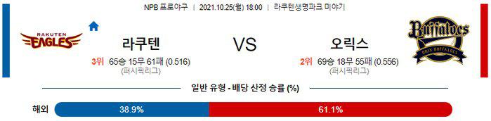 퍼시픽리그 평균자책점과 탈삼진 1위를 달리고 있는 야마모토 요시노부 투수를 믿어야 하는 경기. 또한, 1996년 이후 25년만의 리그 우승을 노리고 있는 오릭스는 반듯이 승리가 필요한 상황 이다. 오릭스 승리 가능성을 추천 한다.