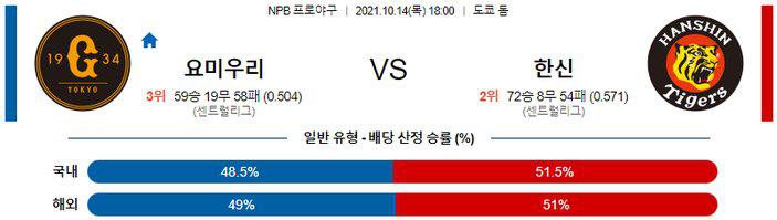 일 경기 2-2, 무승부를 기록하면서 7연패에서 탈출하지 못한 요미우리 이다. 또한, 올시즌 요미우리를 상대로 13K가 동반 된 완봉승을 기록한 타카하시 하루토 투수에 대한 기대치가 높은 선발 매치업 이다. 한신 승리 가능성을 추천 한다.
