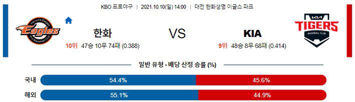 전일 경기에서는 기아가 6-4 승리를 기록하며 시리즈 기선제압에 성공했다. 시즌 48승8무68패 성적. 10안타(1홈런)를 기록하는 타선의 각성이 나타났고 8명의 투수를 투입하는 벌떼 마운드 운영을 통해서 승리를 가져간 경기. 반면, 한화는 2연패 흐름 속에 시즌 47승10무74패 성적. 5안타(1홈런)에 그쳤고 선발 카펜터 투수가 6이닝 6실점 패배를 기록한 경기.
