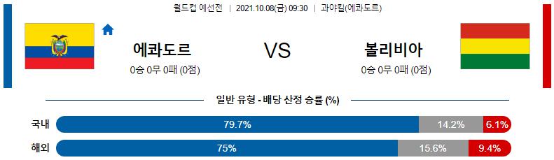 홈 이점을 갖춘 에콰도르가 상대를 몰아칠 준비를 마쳤다. 공·수 양면에서 밀리는 구석이 없으며 성적 또한 상대보다 낫다. 볼리비아가 난전을 꾀하지만 이미 붕괴된 수비는 손 쓸 수 없는 지경이다. 에콰도르 승, 오버 ▲(2.5점 기준)를 예상하는 쪽이 옳다.