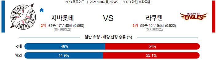 8월 이후 발전 된 투구내용을 보여주고 있다고는 하지만 힘으로 윽박지르는 사사키 로키 투수 보다는 후반기 노려한 마운드 운영 능력이 돋보이고 있는 노리모토 다카히로 투수가 우위에 있는 선발 매치업 이라고 생각 된다. 또한, 라쿠텐은 올시즌 사사키 로키 투수에게 홈런을 기록한 리드오프 야마자키 쓰요시가 6경기 연속 안타를 기록하는 가운데 좋은 타격감을 유지하고 있는 상황. 라쿠텐 승리 가능성을 추천 한다.