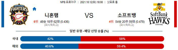 소프트뱅크는 3위 라쿠텐에게 6.5게임 차이로 뒤쳐지면서 가을야구 입성이 힘들어진 상황. 하지만, 홈에서 에이스 센가 고다이 투수가 선발로 나오는 경기라면 자존심 회복을 위한 소프트뱅크 야수들도 이전과 다른 집중력을 보여줄 것으로 기대된다. 니혼햄 승리 가능성을 추천한다.