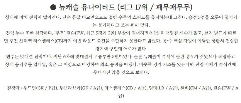 US 사수올로 (리그 12위 / 패패패패승) 지난 라운드 살레르니타나 전서 1-0 승리를 거두고 리그 3연패 부진서 벗어났다. 팀 에너지 레벨을 소폭 올린 상황서 난전 유도까진 가능하다. 공격력이 살아났다. 주전 공격수 베라르디(RW, 최근 5경기 2골 1도움)가 2경기 연속골을 적중하며 퍼포먼스를 끌어올렸고, 반대편 보가(LW, 최근 5경기 1도움) …