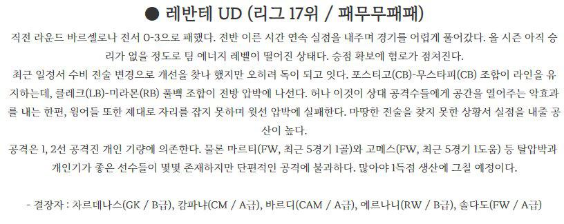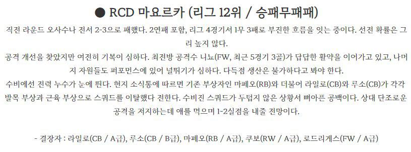 [ RCD 에스파뇰 ] 에스파뇰은 현재 리그 14위에 위치하고 있으며 지난 경기에서 2:0으로 패배를 기록했다. 전반전에 선제골을 허용했고 데 토마스 득점을 기록했지만 오프사이드로 노골로 허용했고 후반전에 분투하는 모습을 보여줬지만 역으로 실점을 허용하며 무득점을 참패를 기록했다. 에레라와 푸아도가 부상중에 있지만 전력에 큰 문제 없다고 판단된다. …